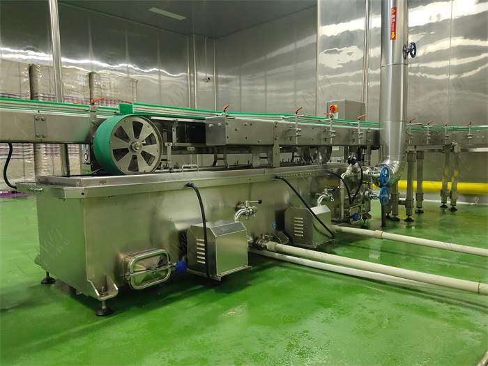 清洗 -> 2. 去皮 -> 3. 打漿/破碎 -> 4. 調配 -> 5. 融糖 -> 6. 均質 -> 7. 預熱 ->8. 空罐卸垛 -> 9. 空罐清洗(高壓噴淋) -> 10. 空罐吹干/瀝干 ->11. 自動灌裝 -> 12. 抽真空/蒸汽噴射(排除罐頂空氣) -> 13. 真空封口 ->14. 殺菌 -> 15. 冷卻 -> 16. 吹干(去除表面水漬)-> 17. 噴碼 -> 18. 貼標 -> 19. 自動開箱 -> 20. 自動裝箱 -> 21. 自動封箱 -> 22. 機器人碼垛 -> 23. 成品入庫